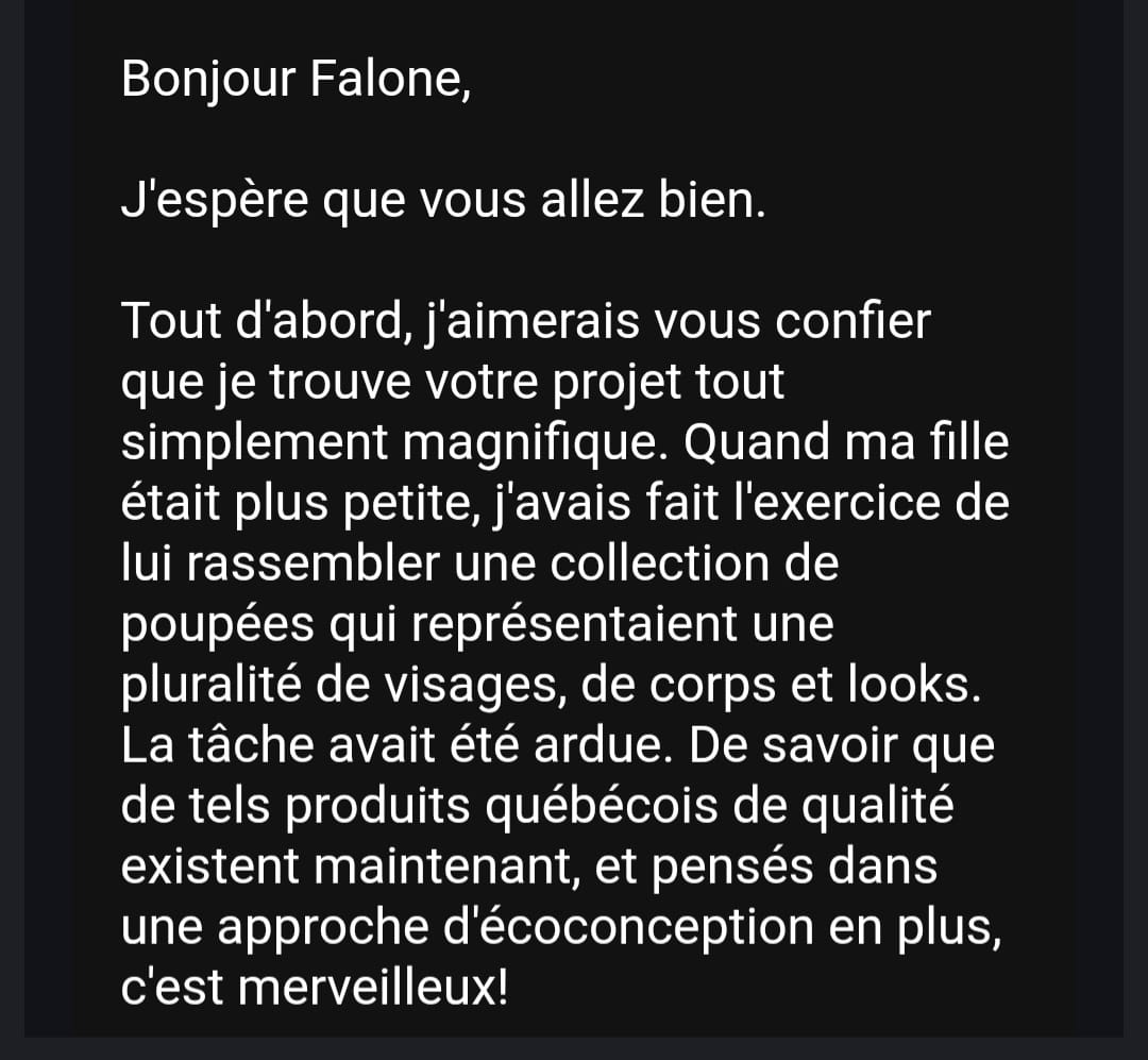 Ici, chaque poupée raconte une histoire: celle de la diversité, de la fierté et de l'amour de soi. Nos poupée écoresponsables ne sont pas de simples jouets: elles sont des compagnons de confiance qui aident les enfants à grandir avec courage, imagination et respect de leur identité.